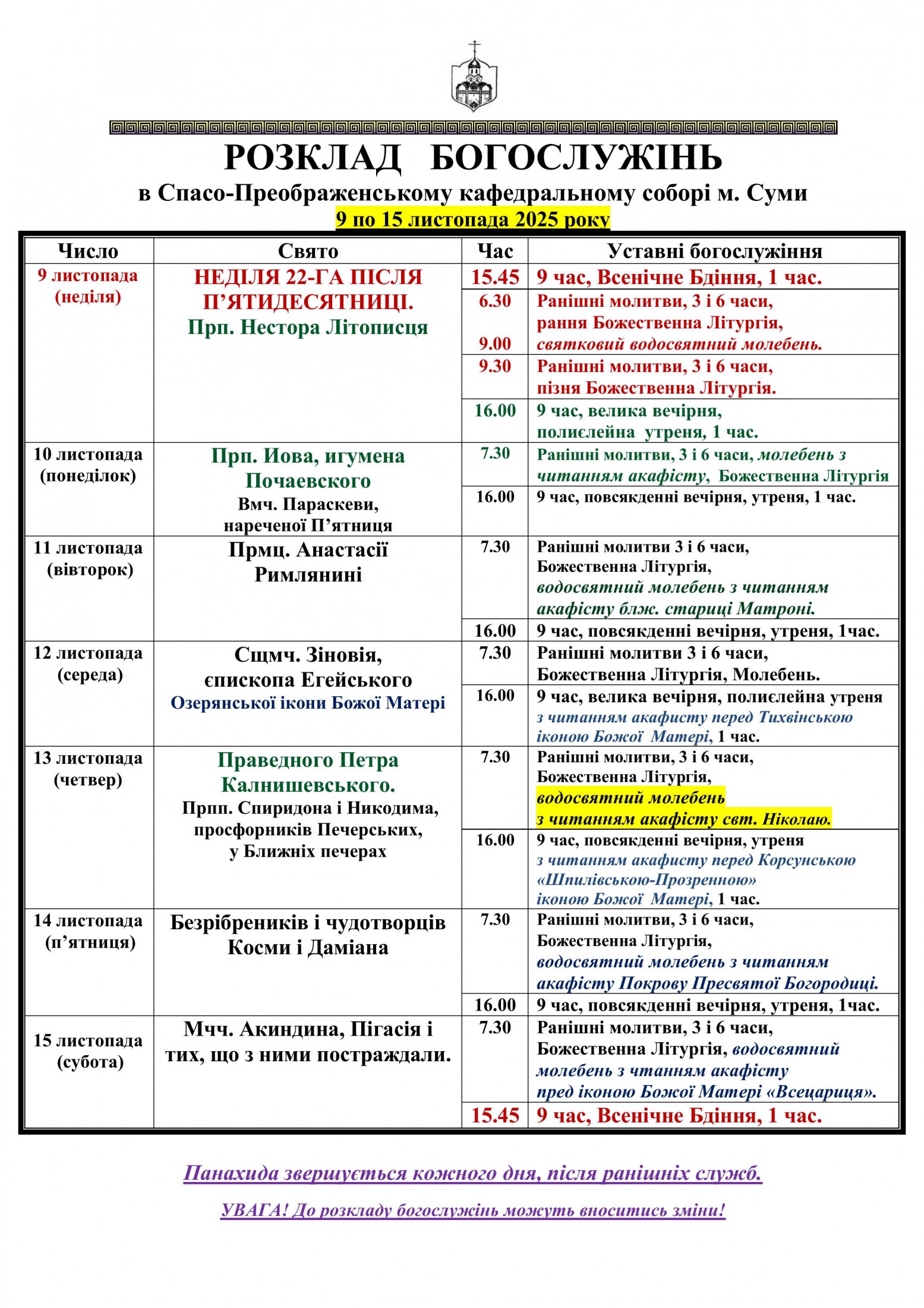 Розклад богослужінь у Спасо-Преображенському кафедральному соборі