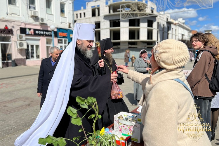 Після Божественної літургії митрополит Євлогій відвідав благодійний ярмарок в рамках акції «До Світлого Дня – світлі вчинки» на допомогу онкохворим дітям Сумщини, що відбувався на подвір’ї Спасо-Преображенського кафедрального собору м. Суми.