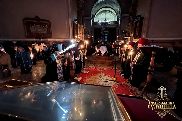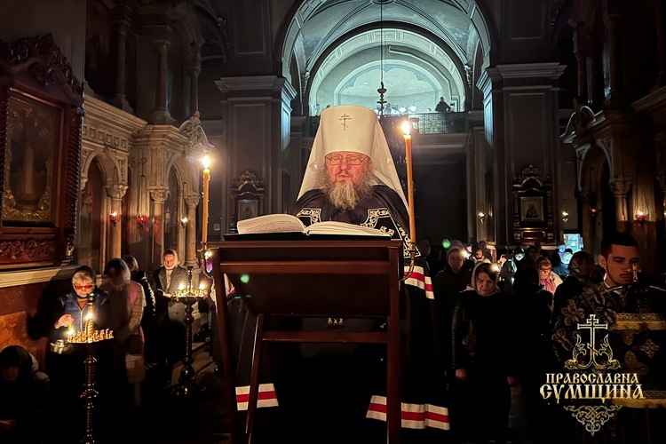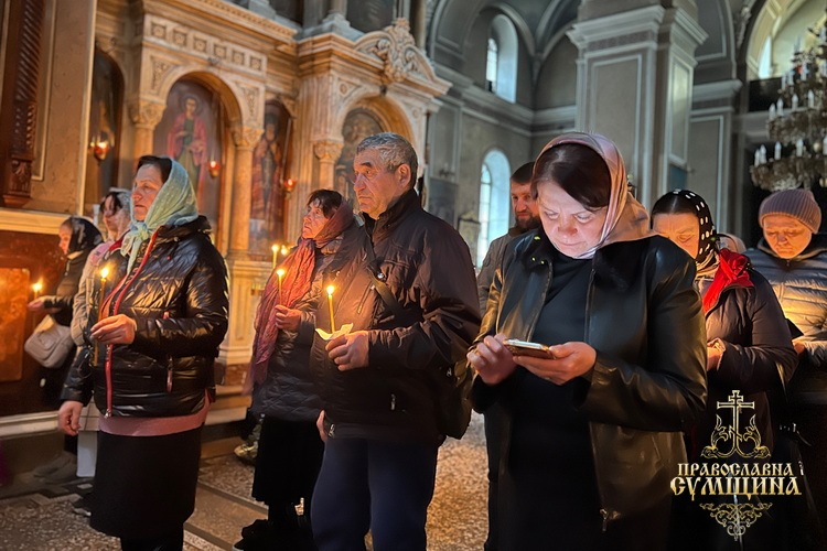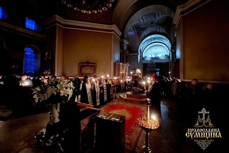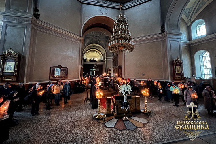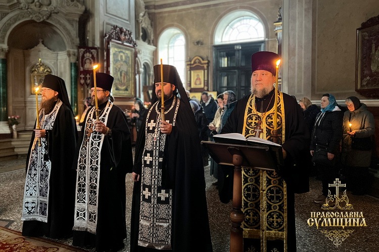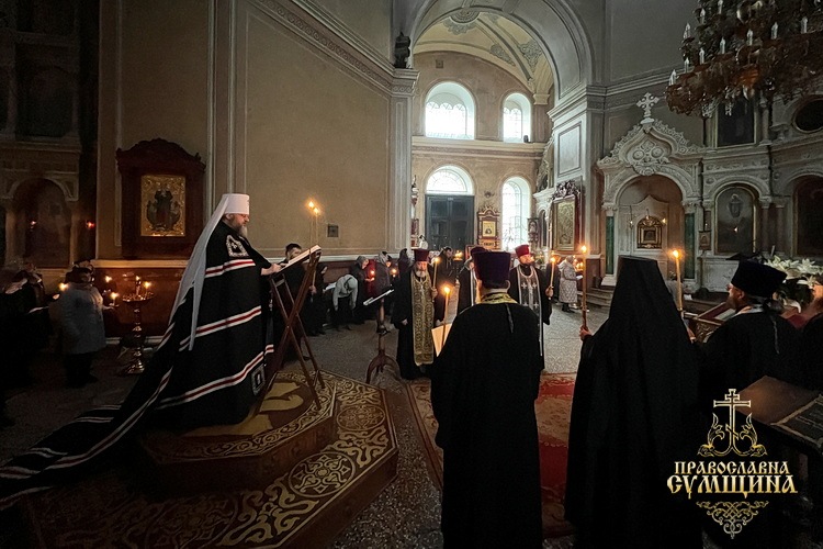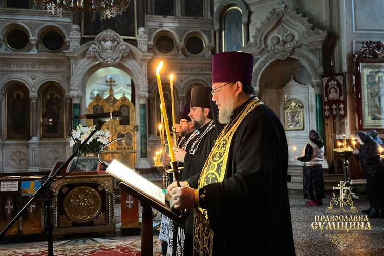 Богослужіння очолив митрополит Сумський і Охтирський Євлогій у співслужінні соборного духовенства. Величні тексти канону, сповнені глибокого духовного змісту, цього вечора звучали особливо проникливо у світлі запалених свічок, які тримали у руках священнослужителі та богомольці.