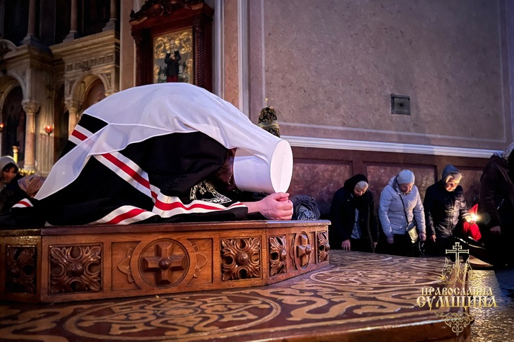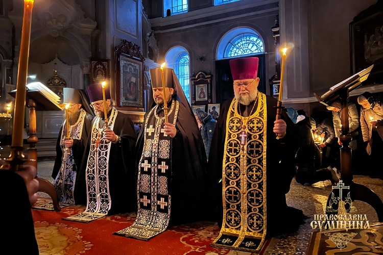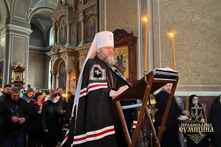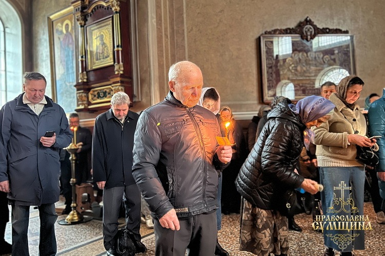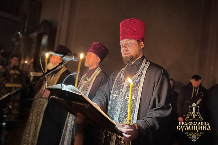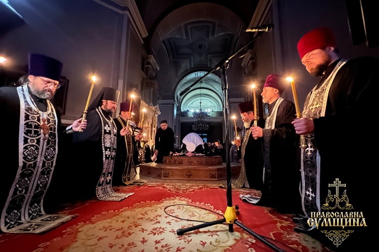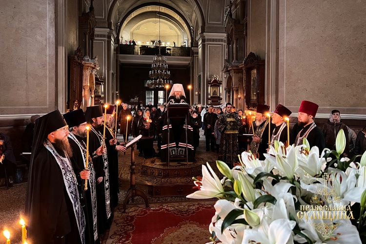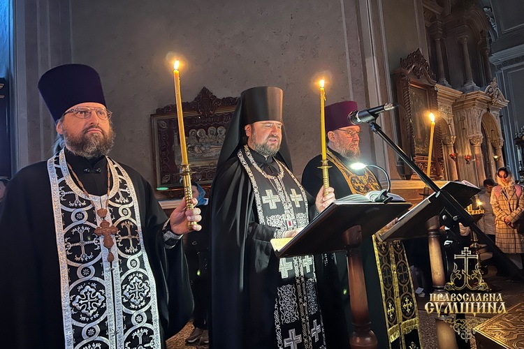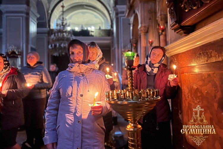 Богослужіння очолив митрополит Сумський і Охтирський Євлогій у співслужінні соборного духовенства. Величні тексти канону, сповнені глибокого духовного змісту, цього вечора звучали особливо проникливо у світлі запалених свічок, які тримали у руках священнослужителі та богомольці.