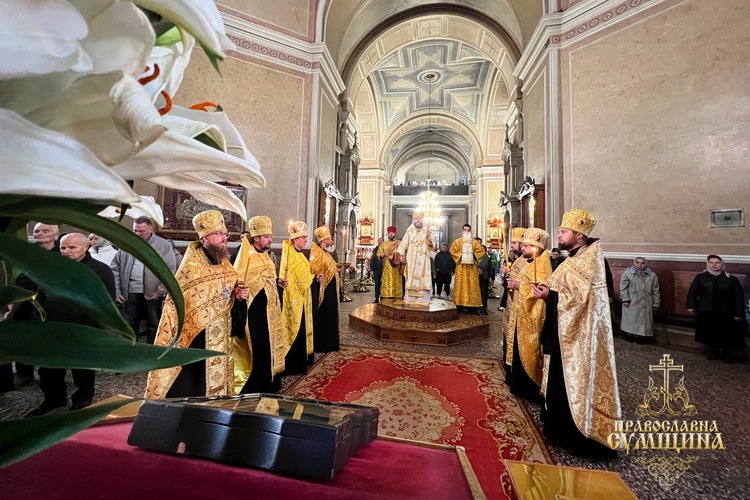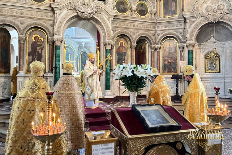 Наприкінці літургії був відслужений короткий молебний спів до Пресвятої Богородиці перед чудотворною Корсунською-Шпилівською Її іконою, йменованою «Прозренна», митрополит Євлогій прочитав Сумську молитву до Пресвятої Богородиці про заступництво під час війни.