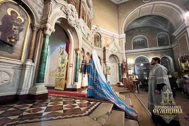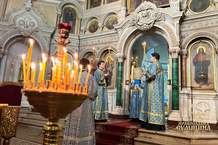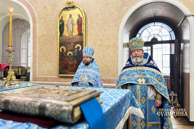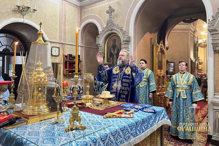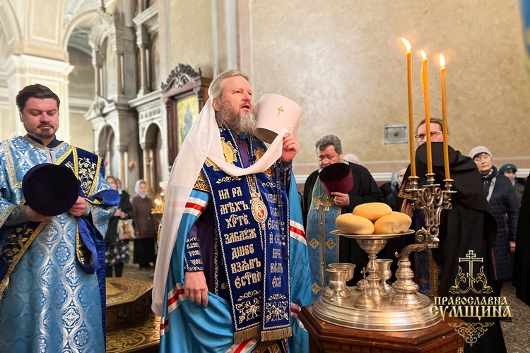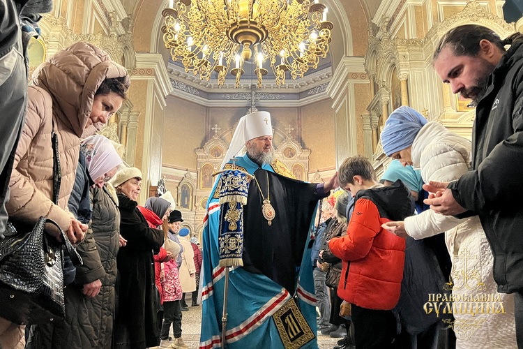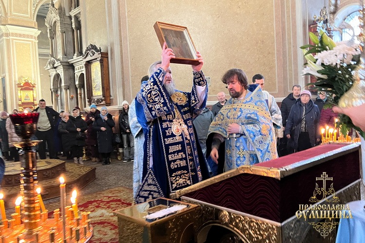 Наприкінці Літургії відбулося славлення перед святковою іконою Введення до храму Пресвятої Богородиці. Владика Євлогій підніс Сумську молитву до Богородиці під час війни та благословив усіх богомольців.