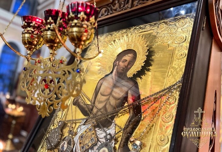 Увечері 21 грудня 2025 року в Спасо-Преображенському кафедральному соборі міста Суми Високопреосвященніший митрополит Сумський і Охтирський Євлогій очолив соборне звершення акафісту Господу Іісусу Христу Сладчайшому перед Малочернеччинським чудотворним образом «Хліб Життя».
