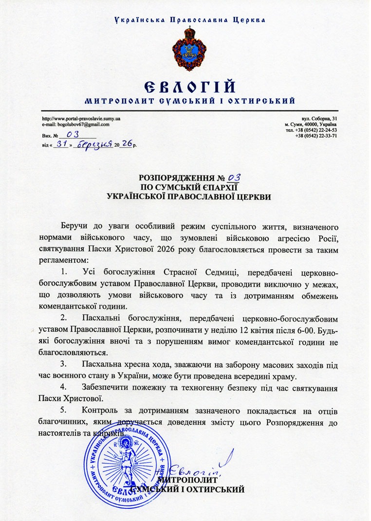 Управління Сумської єпархії повідомляє, що згідно з розпорядженням митрополита Сумського і Охтирського Євлогія встановлено такий порядок проведення богослужінь у Страсну Седмицю та на Світле Христове Воскресіння 2026 року: