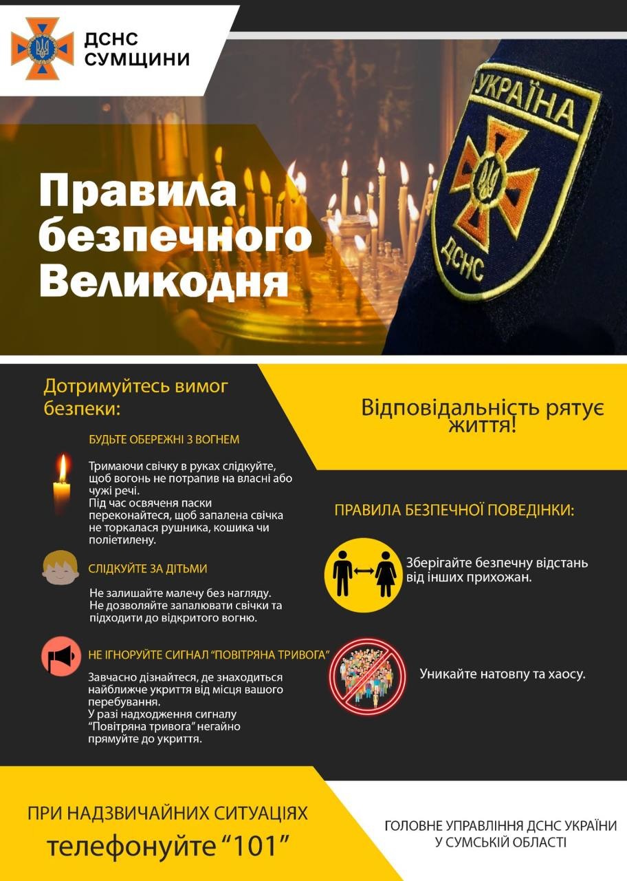 Духовенству та вірянам нагадуємо про обов’язкове дотримання правил пожежної та техногенної безпеки, а також про порядок дій під час повітряної тривоги. Пам’ятки, підготовлені Управлінням ДСНС у Сумській області, розміщено для ознайомлення на парафіях та на сайті єпархії.