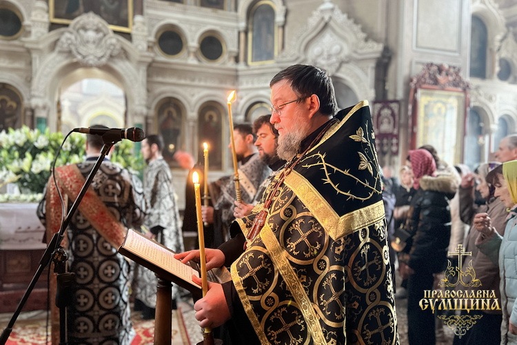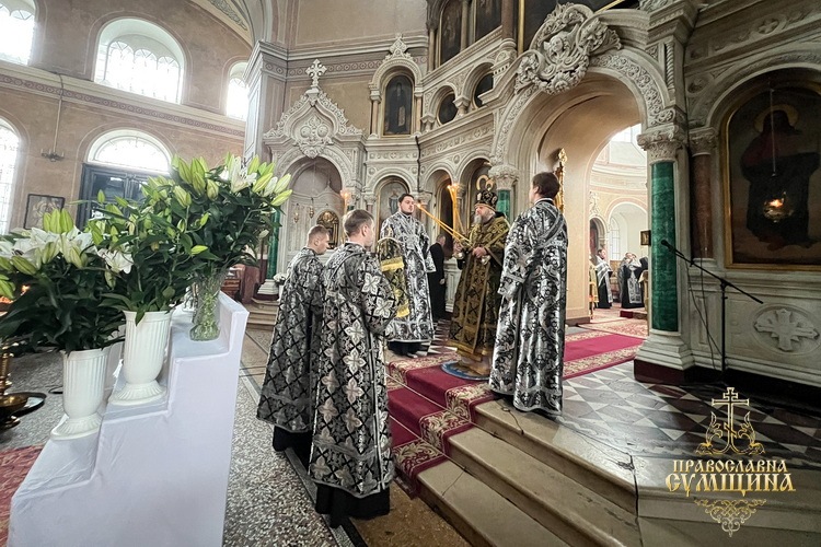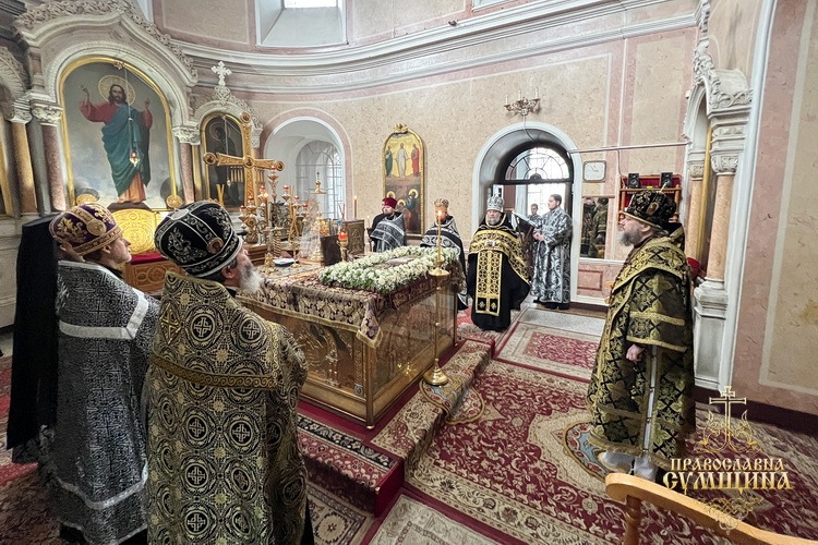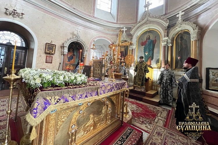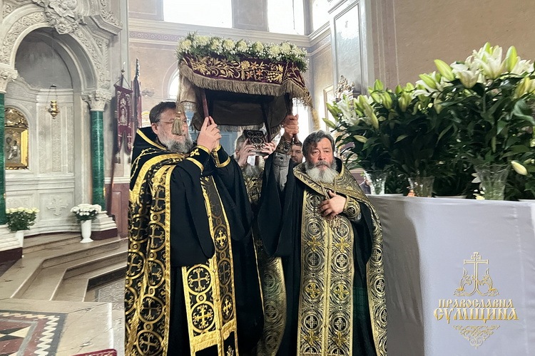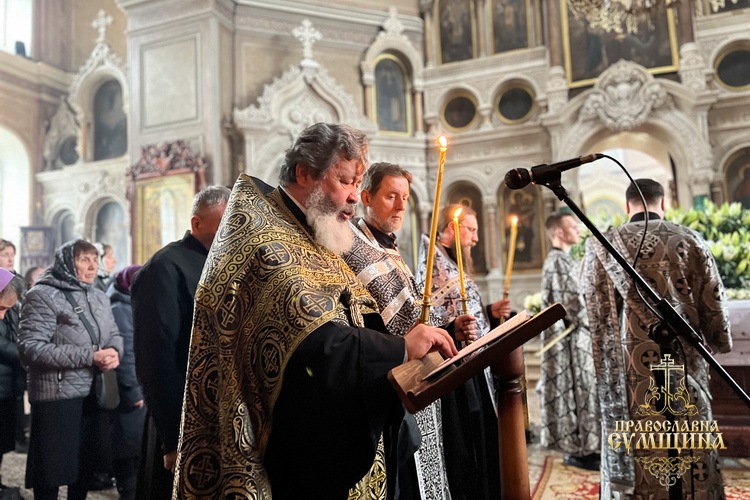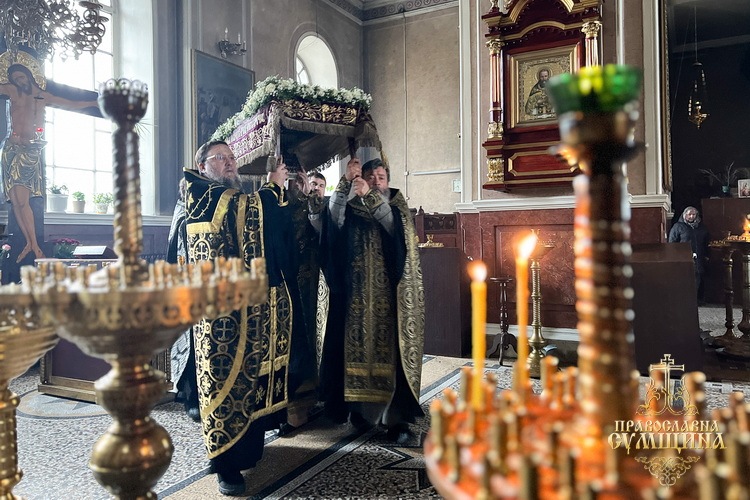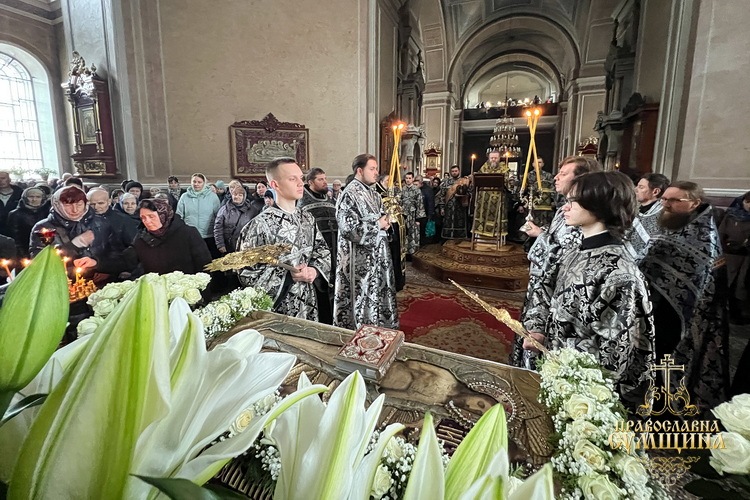 Високопреосвященніший митрополит Сумський і Охтирський Євлогій очолив вечірню з виносом Святої Плащаниці, а також звершив читання канону на розп’яття Господа і на плач Пресвятої Богородиці на малому повечір’ї. Згодом було відслужено утреню Великої Суботи з чином погребіння Плащаниці — богослужіння, що символічно відтворює погребіння Спасителя, — після чого відбулася хресна хода всередині собору.
