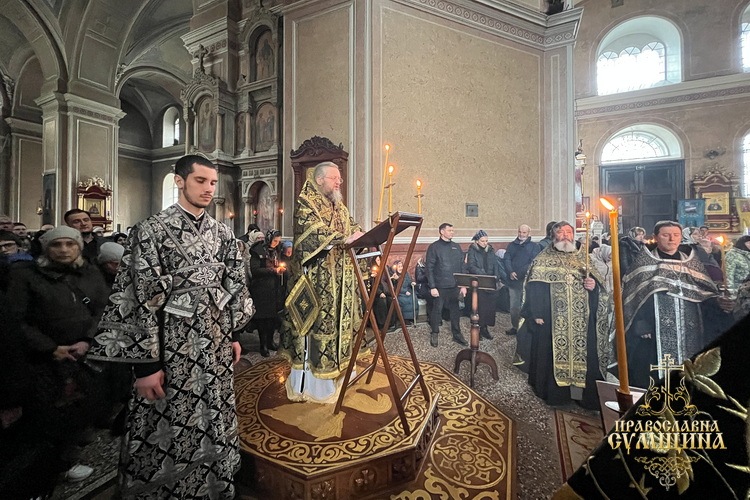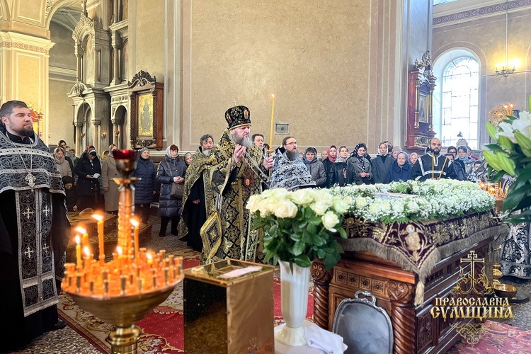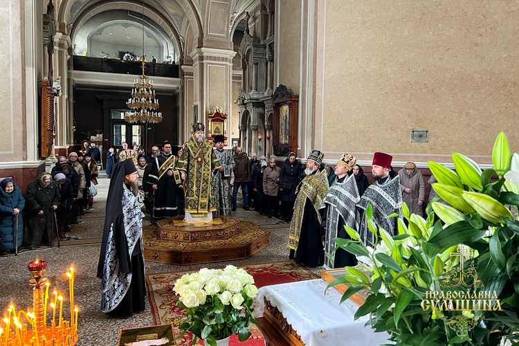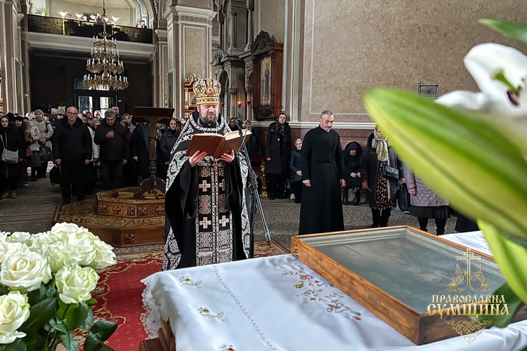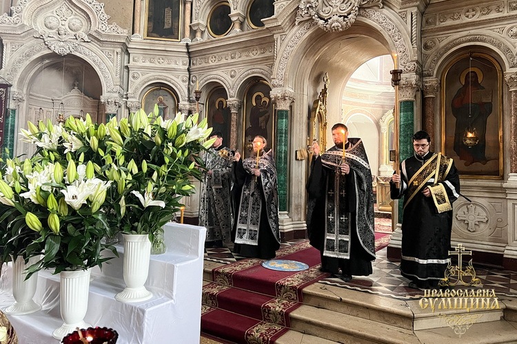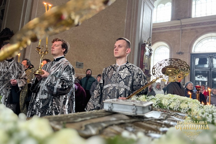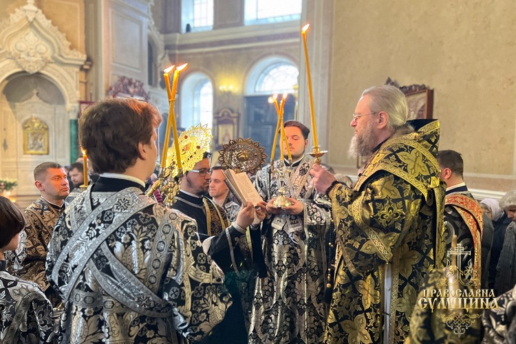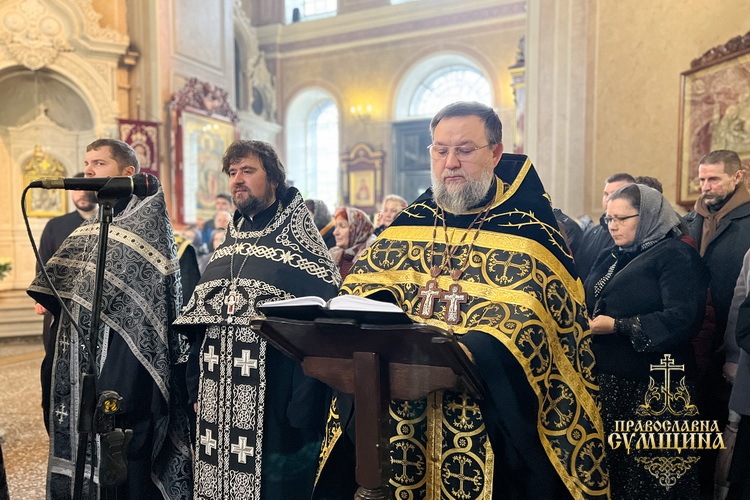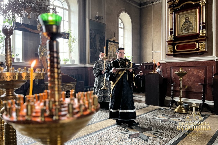 Високопреосвященніший митрополит Сумський і Охтирський Євлогій очолив вечірню з виносом Святої Плащаниці, а також звершив читання канону на розп’яття Господа і на плач Пресвятої Богородиці на малому повечір’ї. Згодом було відслужено утреню Великої Суботи з чином погребіння Плащаниці — богослужіння, що символічно відтворює погребіння Спасителя, — після чого відбулася хресна хода всередині собору.