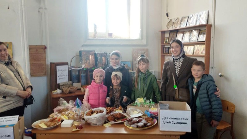 7 квітня 2026 року в Покровському соборі міста Охтирки після святкового богослужіння відбулася благодійна ярмарка зі збору коштів у межах єпархіальної акції допомоги онкохворим дітям Сумщини «До Світлого Дня – світлі вчинки!».